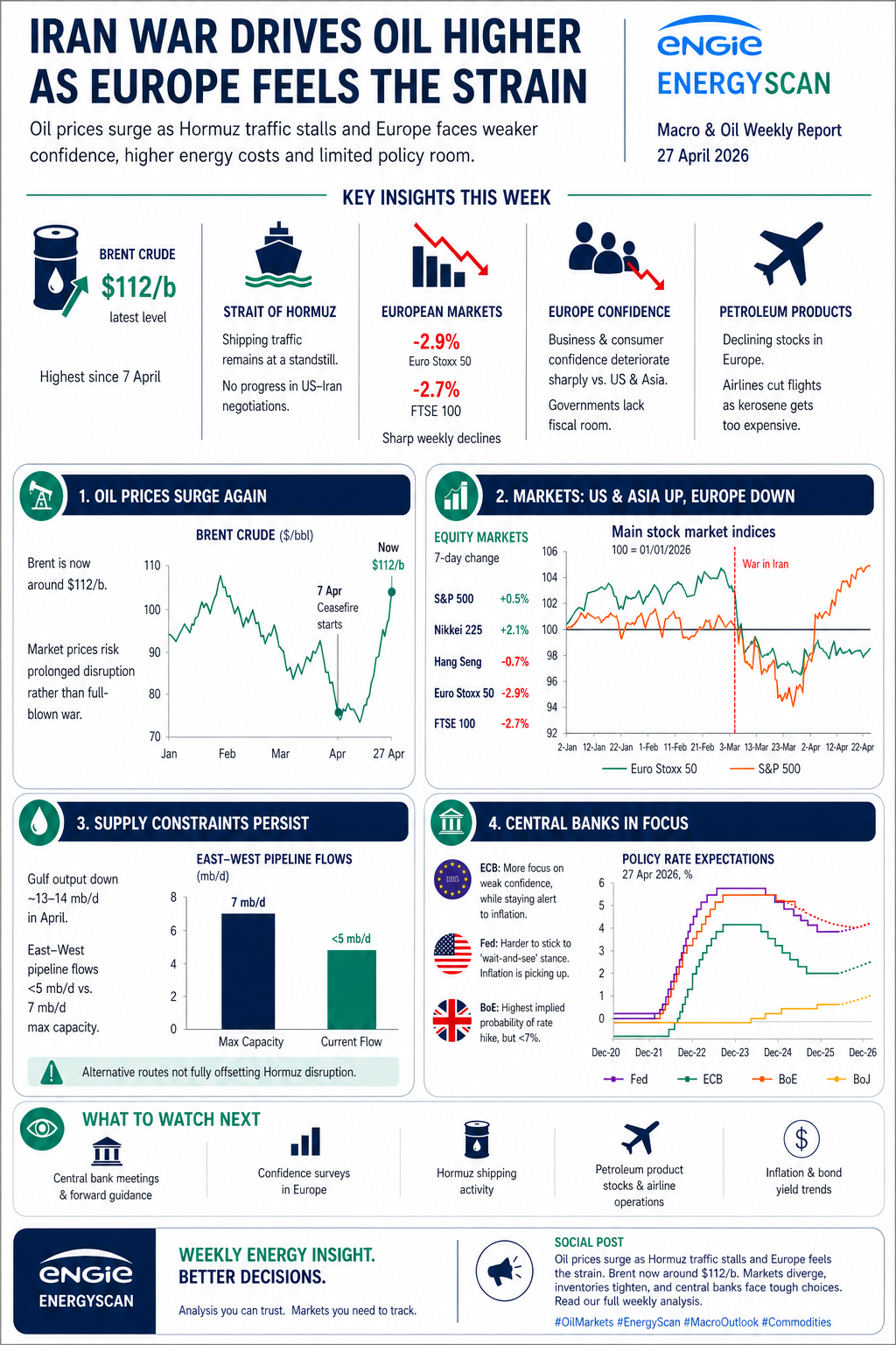 The Iran war is increasingly shaping energy and macroeconomic conditions. Oil markets are pricing prolonged disruption, with Brent now around $112/b, while Europe is already feeling the pressure through weaker confidence, falling equity markets and concerns over petroleum product availability. For market participants, the key issue is no longer only whether the conflict escalates, but how long disrupted flows and elevated energy costs can persist.