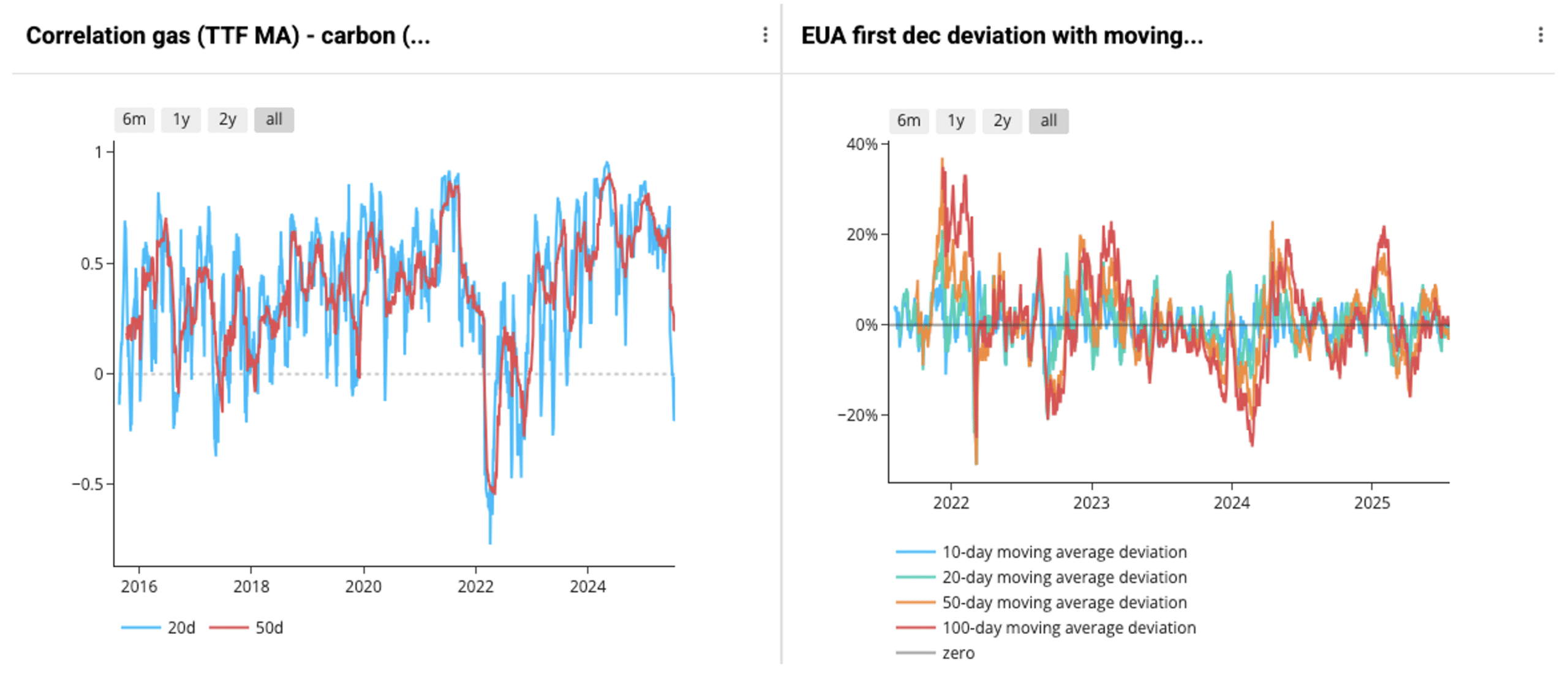 Interactive charts and tables covering European power and EUA markets with technical analysis indicators, fundamental markers (production costs, capacity trades, guarantee of origins) as well as geographical and time spreads